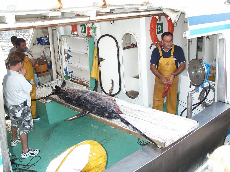 Ausladen im Hafen von Cala Ratjada. Im Fang ca. 80 dieser Schwertfische.